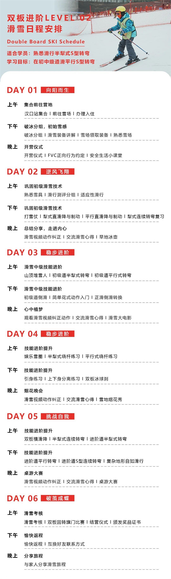 滑雪冬令营课程从孩子的兴趣爱好出发,分设双板和单板两种滑雪课程。由专业团队遵循探知乐途儿童青少年滑雪教学体系,细分等级,设计出适宜的课程安排。