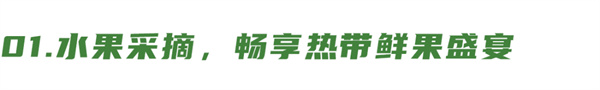 亲子在果园中亲手采摘多种多样的热带水果,例如菠萝蜜、香蕉、蛋黄果、红毛丹…不仅能品尝到新鲜美味的果实,还能了解不同水果的生长习性和特点,感受热带水果生长天堂的独特魅力。