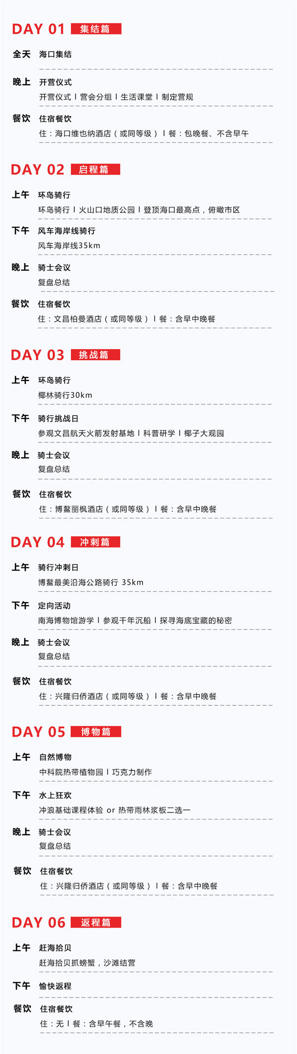 舒适的气候、美丽的风景和厚重的人文,加之海南岛东线骑行的难度和路况非常适合孩子们骑行。这是一场毅力挑战,也是一次塑造之旅。