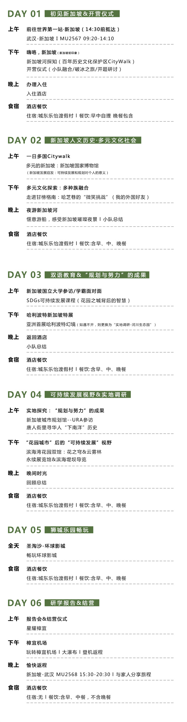 新加坡之行,我们不能仅用“花园城市”概念单一去解读它,“梦想和计划”成就了新加坡,我们应从“多元文化、可持续发展、精英教育、国际视野、公共管理“五个版块探究,带领孩子深度剖析新加坡,感知国际化教育,培养国际化视野,尽情体验新加坡最精华的部分。