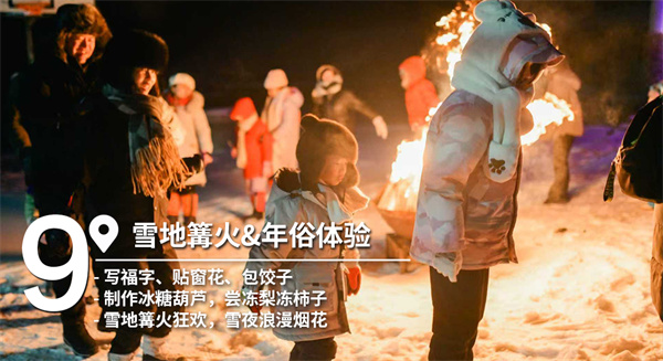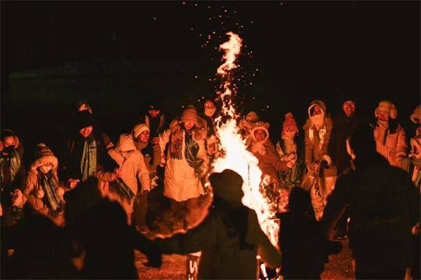 晚餐过后,夜幕降临,一块儿到雪地里点燃篝火,绚烂烟花点亮夜空,鞭炮噼里啪啦作响,关于“年”的记忆和印象在此刻有了具象表达。城市里被禁止的烟花,我们在这里一次玩个够!