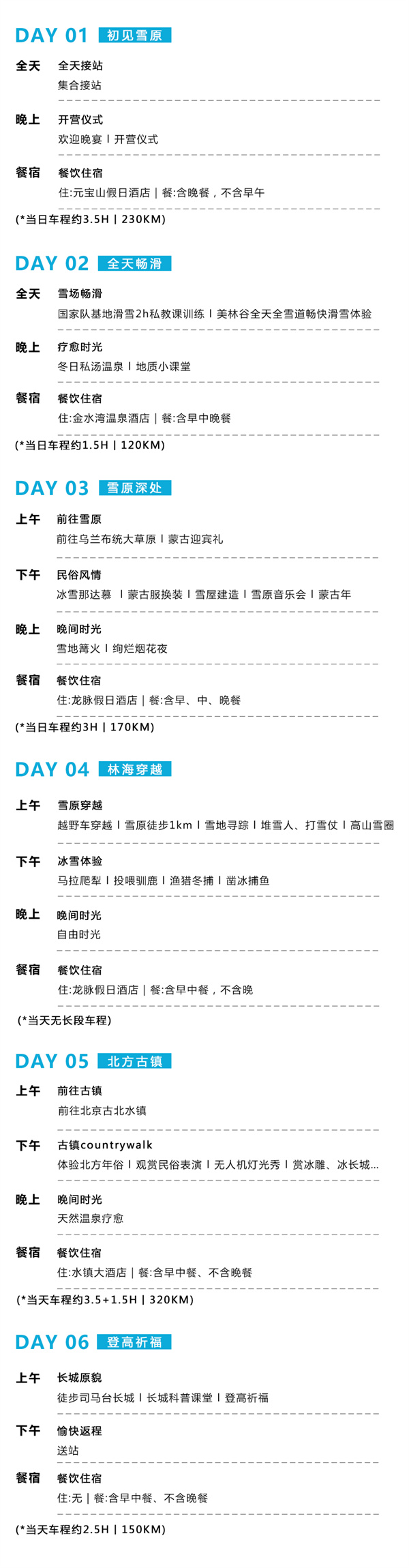 你能想到的冬季玩法,他全部都有!滑雪温泉、雪原穿越、民俗体验、长城古镇、渔猎冬捕、蒙古年俗...这不是走马观花的肤浅打卡,而是献给大家的极致酷玩与顶级雪色的盛筵之旅!我们想做的,就是带每一个家庭,真正走进这个被雪包裹的童话世界,去触摸冬天该有的样子。