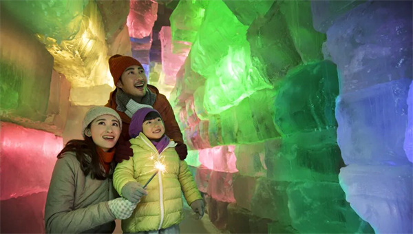 除了各种年俗活动,小镇的雕刻艺术家们就地取材,将一块块冰雕刻成冰屋、冰长城、冰隧道、冰塔等各种各样的景观。让大家今年不用北上,就能到达一个纯净、壮观的冰雪世界!