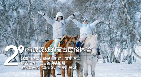 我们将带大家深入雪原深处的牧民老乡家中,走进当地牧民的牧场和蒙古包,特别安排冬季版MINI那达慕,让大朋友小朋友感受到雪原中的少民风情。