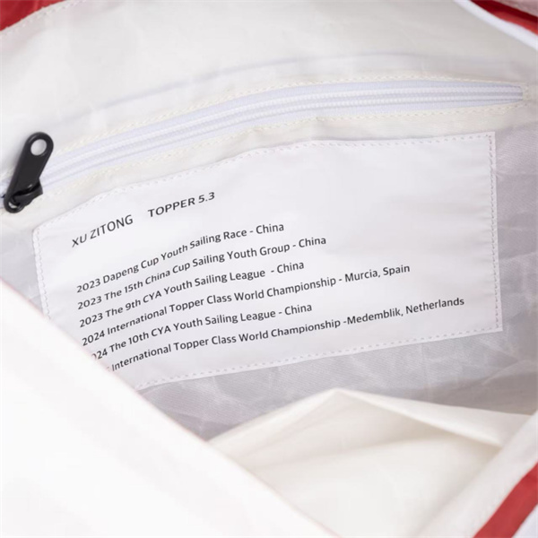 •世锦赛微信群里看到一条“将废弃的赛帆扔进垃圾桶”的信息时引发了我们的家庭讨论, 感慨可惜同时, 也在想这面帆还能用来做什么,帆确实破洞,无法再使用了,可它承载着孩子的回忆,留着叠好只会放在床底积灰。正好佳音爸爸提到,国外有商家将旧帆改成运动包出售, 女儿想借鉴这种模式,把退役的赛帆重新利用起来,制作成背包,她认为她能把包设计得漂亮又实用,而且还可以将这面帆伴随着主人参与的所有比赛用标签的形式缝在包的里面, 成为独特的纪念。这样一来,不仅用创意延续了帆的生命,也在倡导环保的同时, 表达一种真诚的生活态度。 这可不是说说而已, 一回国, 她就和鲲社团的伙伴们开始琢磨包的款式, 和子桐爸爸一同去拜访箱包工厂,以及策划“旧帆重生”的环保活动。看着她忙活着, 我很激动,生活态度的成熟,就是成长。