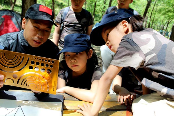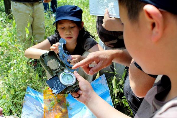专家辅导,具有20年测龄的退役PLA专家手把手的教孩子;城市逃生,营员绘制所住街道小区的逃生路线;野外测绘,营员借助简单的测绘仪器,标出所在位置和周边地形地貌;识图用图,抛弃手机导航,在纸质地图的引导下,营员轻易徒步前进