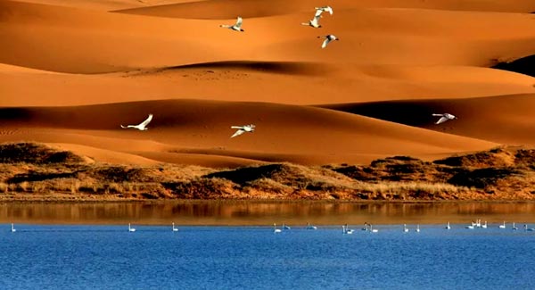希望绿洲:从未想象过能够在沙漠中遇见大片的绿洲,也从未想象过沙漠与湖泊能够相互交融在一起。在腾格里沙漠,这一切皆有可能。在腾格里,你会遇到这梦幻般的一切。高山的积雪在夏季消融,汇入到沙漠的低谷地段。在浩瀚无边的沙漠中,意外的遇到希望的绿洲,明亮的湖泊倒映着湛蓝的天空,给人无限的能量与希望。