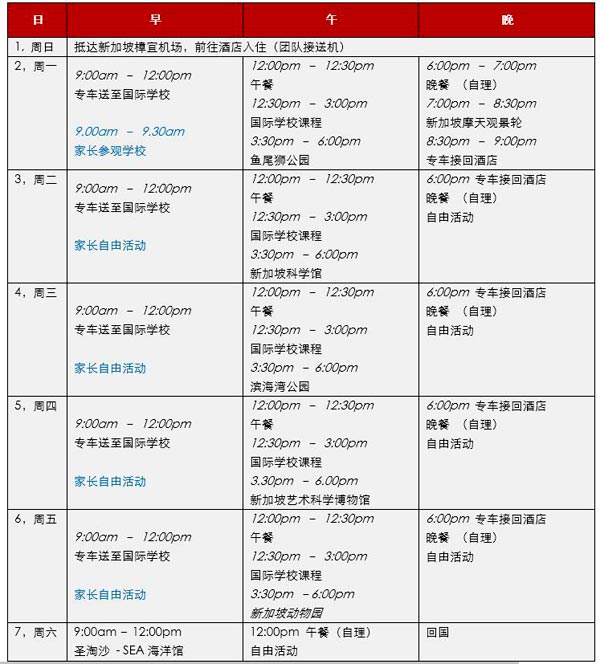 5天在校课程、学习资料;团队接送机、学校专车接送(学生)、当地交通、行程所列景点第一门票;学生及家长酒店双早;学生在校午餐,课间点心;学生露营衬衫;6晚4星酒店住宿(双人房);酒店参考Furama Riverfront,Four Point Hotel,Quality Hotel Marlow或同级酒店;费用不包含 : 机票、签证、保险、其他未列项目费均不包。