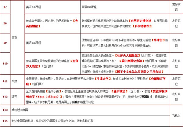 价格包含:报名费3000元(签证费、预订机票费、预定家庭或酒店费);国际交通费及税;境外游览巴士;签证服务费;境外人身保险;境外营队费用和学习费用;行程中景点门票费用;住宿、餐饮费用;导游服务费;全程司机导游小费;冬夏令营结业证书。