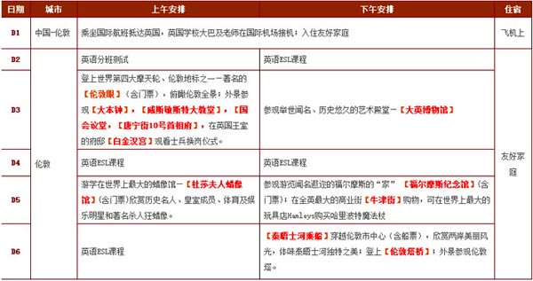 5次伦敦学校ESL英语课程,亲身体验英式教育,学习地道伦敦腔,激发英语学习兴趣,提高英语交流能力;7天寄宿伦敦当地家庭,切身体验英伦生活与家庭文化,提升英文口语及交际能力;探访世界名校:牛津大学、剑桥大学、伊顿公学,发现顶尖名校的厚重底蕴,树立远大学习目标;