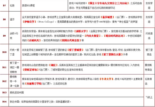 价格包含:报名费3000元(签证费、预订机票费、预定家庭或酒店费);国际交通费及税;境外游览巴士;签证服务费;境外人身保险;境外营队费用和学习费用;行程中景点门票费用;住宿、餐饮费用;导游服务费;全程司机导游小费;冬夏令营结业证书。