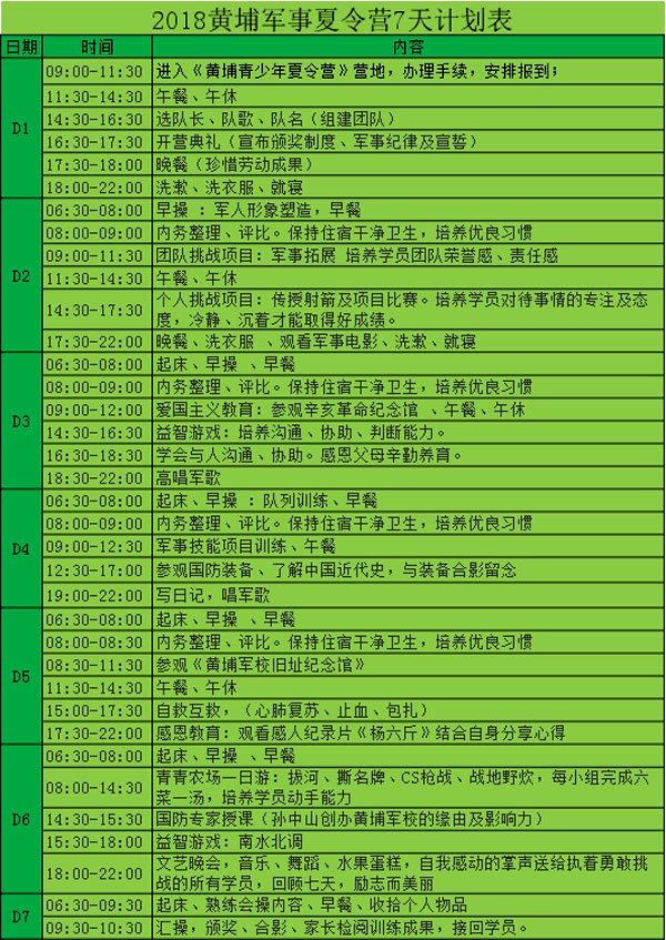 所列活动如受天气等原因影响,训练部据情况调整课程顺序。课程计划中每天早上训练科目:军事基础训练或文明礼貌操,以及整理内务、内务评比。