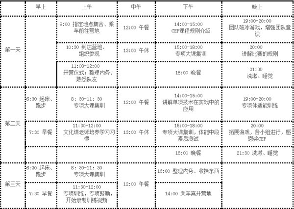 1、训练连续性强:高强度体能训练、拓展训练;2、训练氛围较好:与俱乐部队员共同训练进行乒乓球集体大课训练;3、多元化教学手段:引入动百特CEP运动课程和体适能课程;