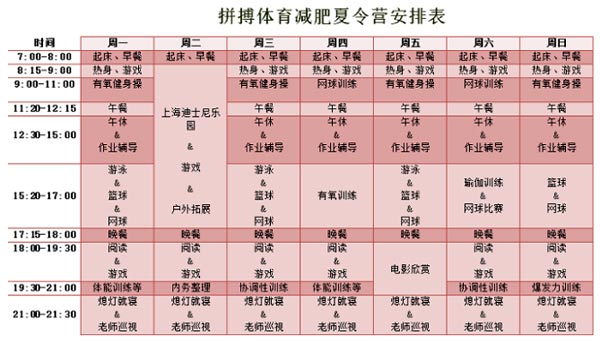 7、培训质量保证和承诺 本届上海拼搏体育减肥夏令营教师为不同等级的学生制定详细和合理的培训课程,如达不到所规定的运动标准和等级,我们承诺,学生继续免费培训,直至达到本夏令营所承诺的标准。