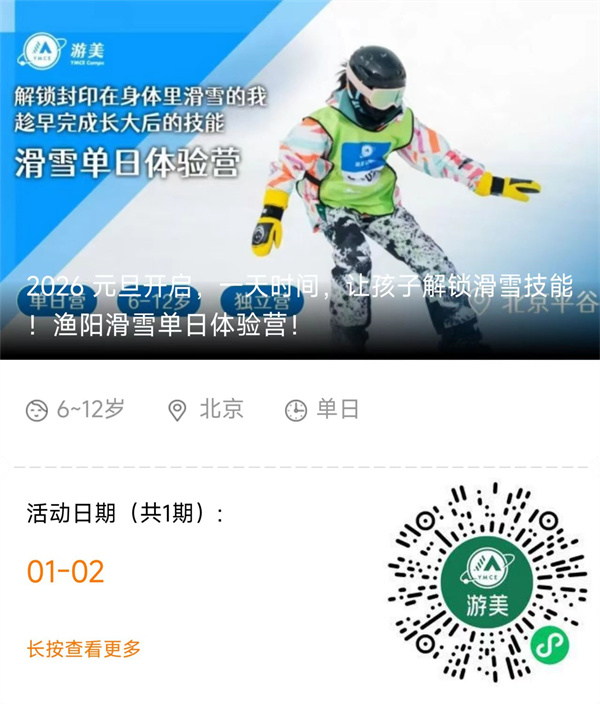 这个元旦起,游美营地将王牌滑雪体验带到家门口!我们倾力推出 【平谷渔阳·滑雪单日营】 ,无需购买单/双板装备,师生比1:1/1:2/1:3三种比例可选。用一天的专业与陪伴,为孩子安全开启滑雪世界的大门,引导他们发现雪上运动的纯粹快乐,真正做到零压力、零基础、零担忧。
