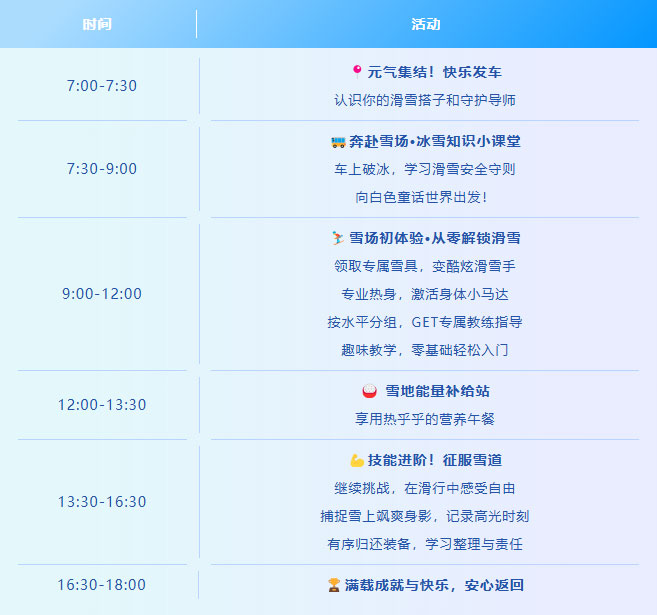 从2018年崇礼滑雪营成为王牌营地,游美始终秉持"体验就是一切"的营地理念。我们深知:让孩子爱上滑雪的关键,是第一次接触雪板时的安心感、第一次滑行成功的成就感。因此,这个单日营不是"简化版营地",而是基于7年数据打磨的"精准启蒙课"——从雪道选择到教学体系,从导师配比到安全防护,每个环节都为儿童量身定制。