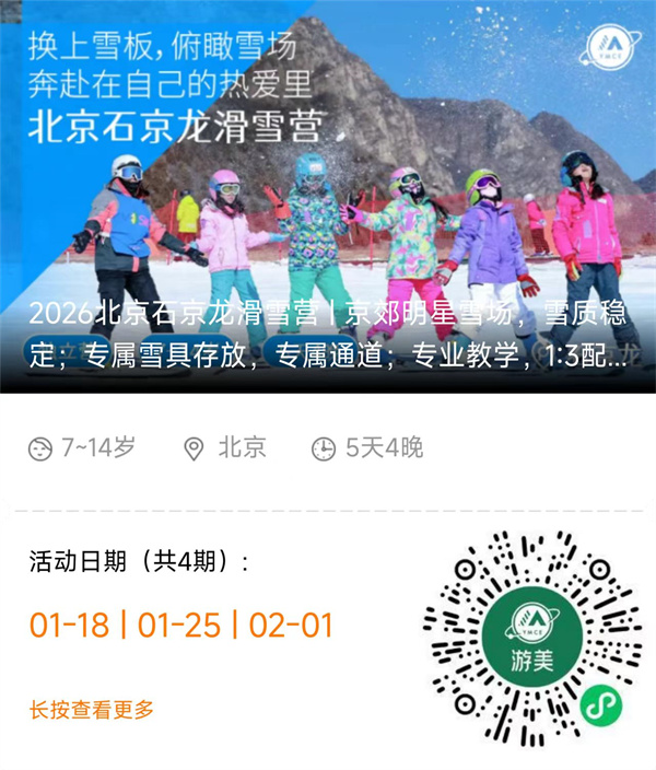 「北京体育」2026石京龙滑雪冬令营(5天)住万豪五钻酒店,五天四晚滑雪之旅,极致性价比