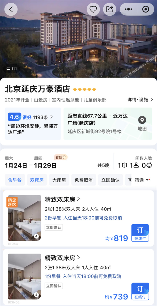 5、延庆万豪酒店2人间(24小时热水,独立卫生间)4晚住宿