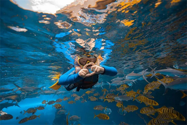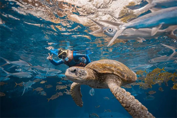别满足于在平静水域扑腾啦——真正的高光时刻现在开始!潜入巨型梦幻水族馆,你不再是旁观者,而是「主角」!触摸从身旁游过的海龟,成千上万彩色鱼群围着你转圈跳欢迎舞~这里没有屏幕,没有边界,就像突然掉进了一部IMAX海洋大片!