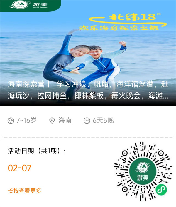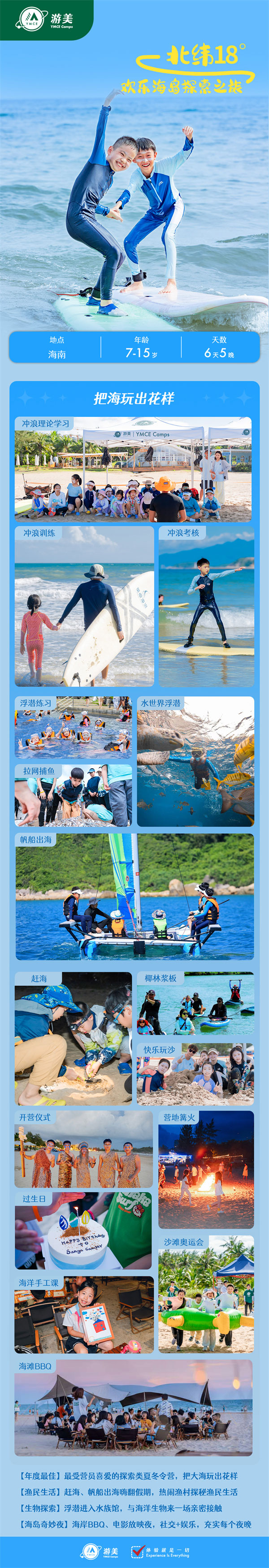 欢迎来到“自然海岛学校”——海南探索营!专为孩子们设计的6天5晚奇幻快乐之旅。在这里,孩子们将沉浸在北纬18°的神奇海岛中,体验20+新奇而富有教育意义的活动。孩子们将有机会尝试各种水上体育运动,感受海浪的激情与自由。他们还将踏足特殊的地貌,进行刺激的探险活动,挑战自己的勇气和智慧。此外,孩子们还将学习户外生存技能,这些技能在城市中是难以接触到的。