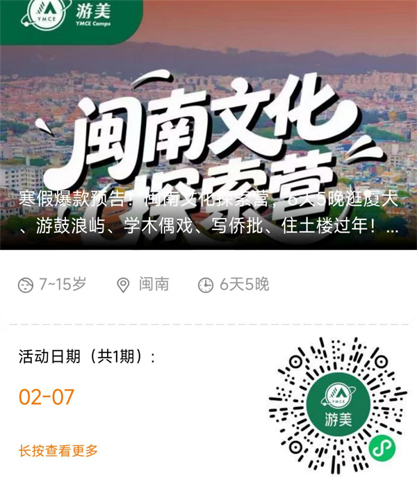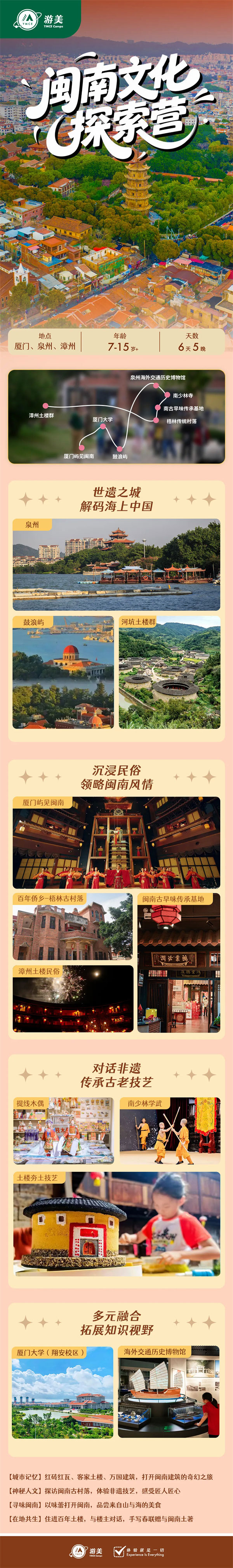 2026年寒假,游美·闽南文化探索营 将串联厦、泉、漳三城,带孩子步入一座“可触摸、可参与、有温度”的活态课堂。从地理与历史读懂闽南,以非遗体验反观人文,在“爱拼才会赢”的血液里,感受多元、包容、共生的力量——学会在多文化之间,自信交往,和而不同。