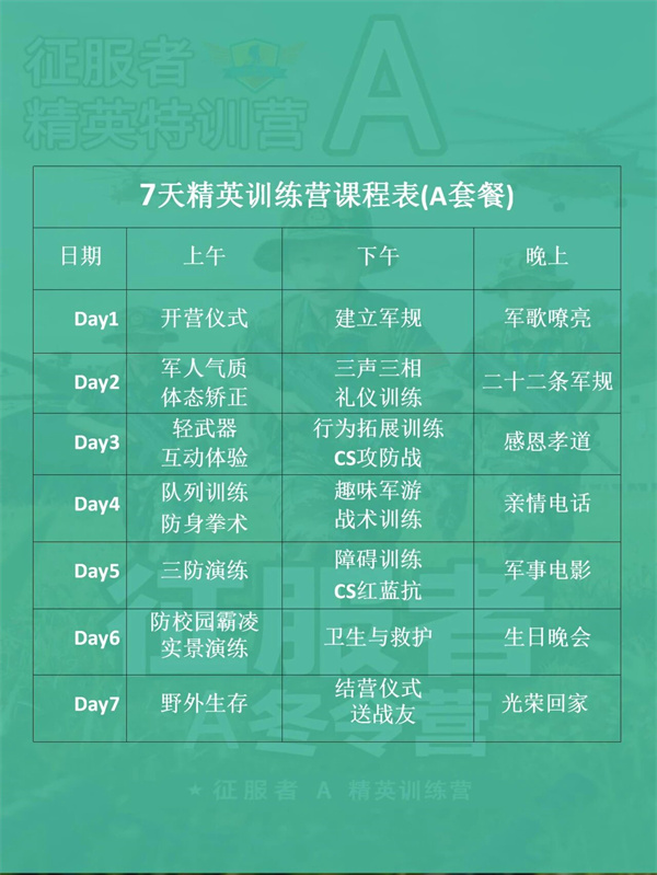 教官配备:30-35名学员组成一个班,每班配一名主教官、一名助理教官、一名医务教官、一名生活教官。